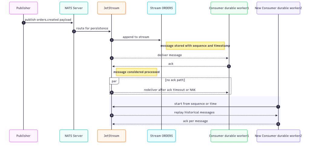 • Consumers acknowledge messages when processed, otherwise JetStream will redeliver them.