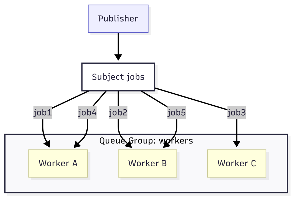 - Multiple subscribers in the same queue group share the workload.